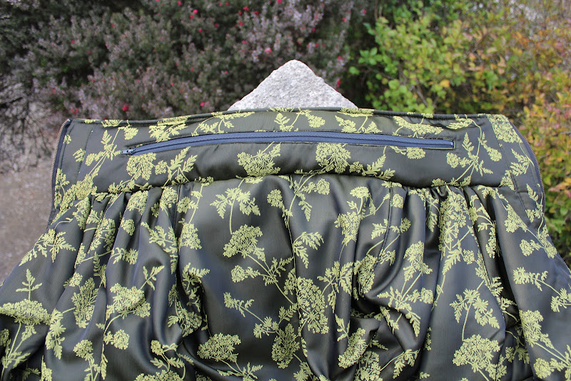 - For the lining, I used two fabrics. For the sleeves and collar, I used the same jacquard as the outside, but I used the reverse (lighter green) side. I didn't have enough for the body, so I also used a gorgeous, textured, stretch fabric, also from stash. I lined the sleeves to the very edge so that I could fold them back to create a contrasting cuff.